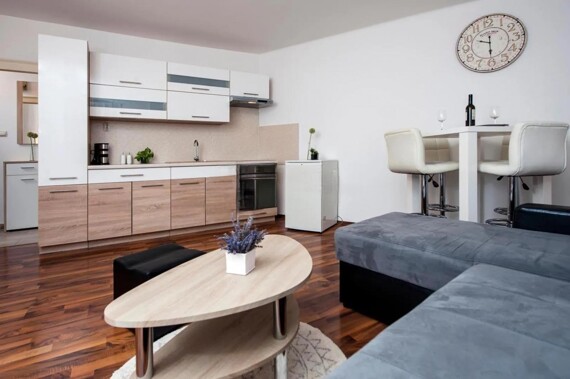 Stan se sastoji od ulaznog hodnika,kuhinje s prostranom blagovaonicom i dnevnim boravkom,spavaća soba i kupaonica.